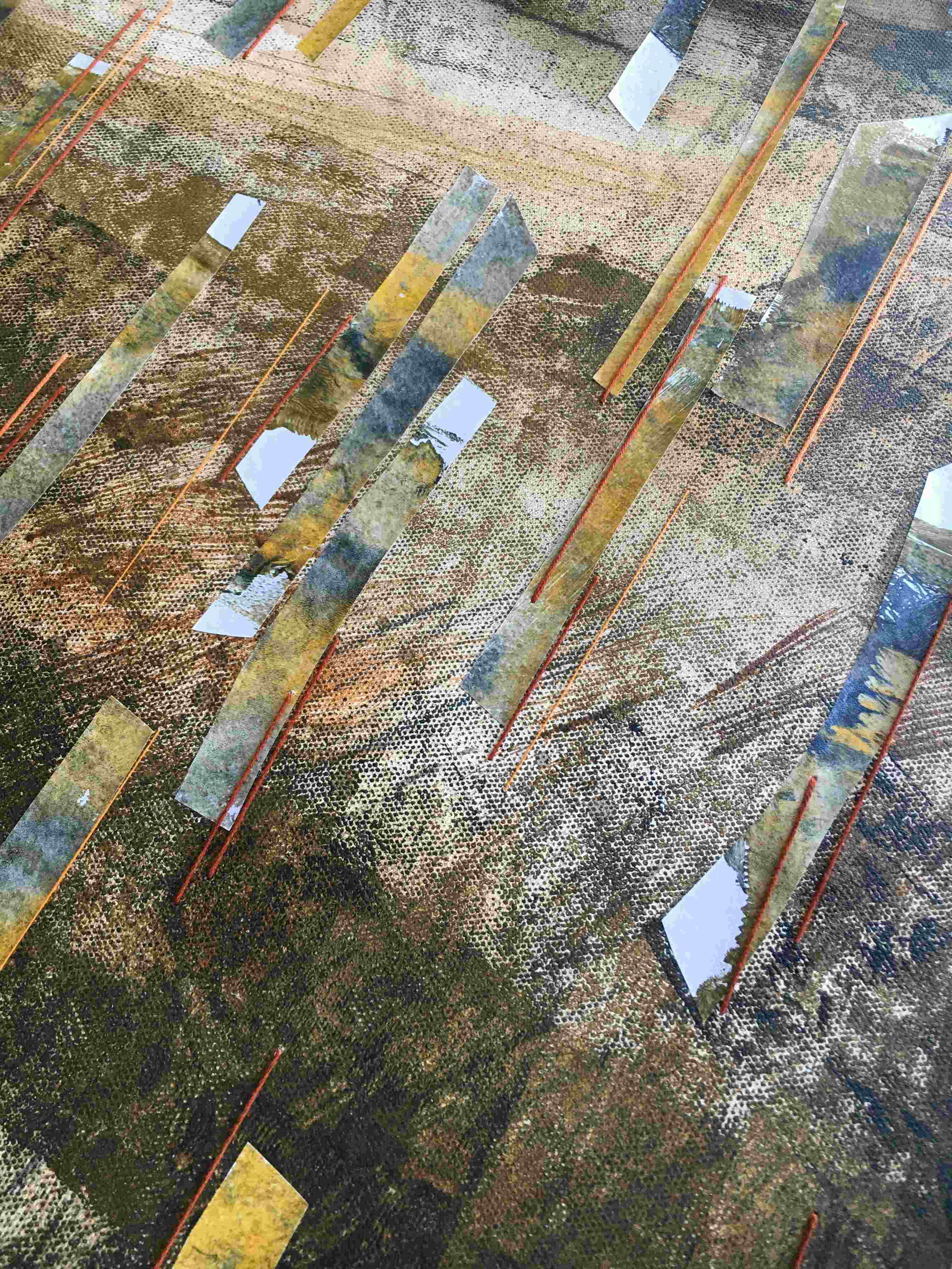 Following observation comes a distilling of the ideas, colours, atmosphere. Working in mixed media and collage, initially on paper in a very rapid and free way, I use acrylic paint, inks, wax resist, mono print and mark making techniques. The works on paper become pieces in their own right, and I am currently developing these into larger work on canvases, embellishing with embroidery threads whose colours sing out and give the sharp definition I’m looking for. I work simultaneously on the loom with similar colours, and the link between the two is clear. One leads to the other, and I quite often switch rapidly between weaving and working on paper, and back again. More of my work can be seen at www.veronicapockart.com, and I have a number of pieces in the collection of Kunstuitleen Voorburg.