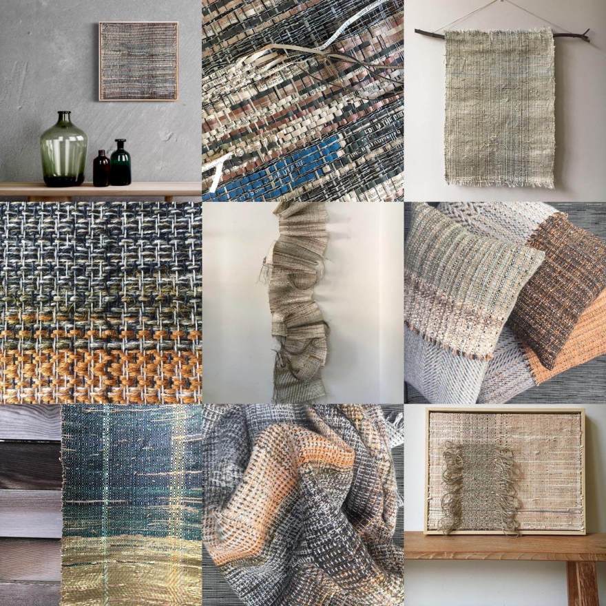 Weaving of pieces for zevenxweven exhibition; mixed paper. linen, hemp and synthetic yarns in the warp and paper in the weft