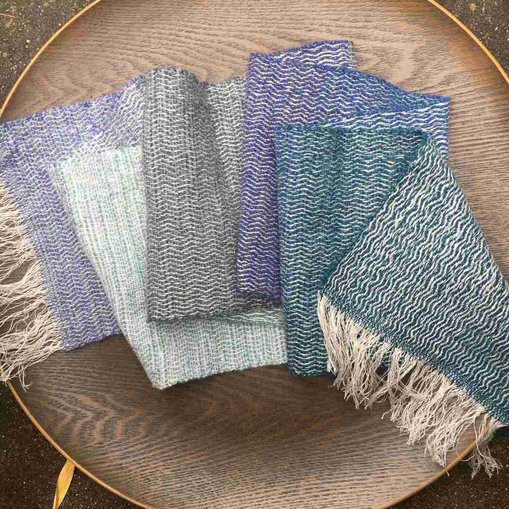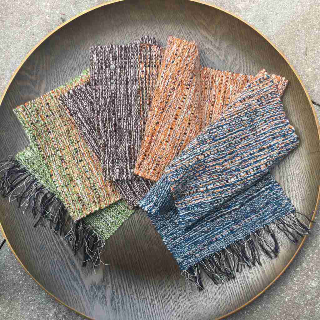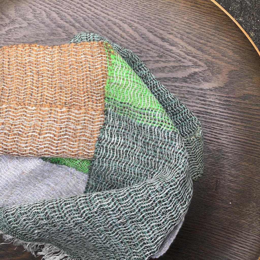 May in the weave studio was very industrious. I’m already thinking ahead to autumn and winter, and weaving lambswool scarves to replenish my depleted stocks. Erring towards greens, but also a warp of vivid pinks and oranges, I hope these new scarves will brighten someone’s grey winter days in the coming year. I’ve also woven two batches using linen warps. The first batch shown in the first four images below uses a natural ecru mix of linen in various thicknesses. The scarves are fairly narrow (21cm wide) but long (almost 200cm), and so would make a great addition to a summer wardrobe as they are light and cool due to the high percentage of linen. They also hang beautifully and have a wonderful sheen. The second batch of four uses a black and grey warp including linen, cotton, and ecological recycled yarn, and comes in vibrant oranges, browns and autumnal tones, using lambswool and Shantung silk in the weft. These are warmer as they have a higher percentage of wool in their make up. Finally below are four 100% lambswool scarves. These are brightly coloured in pinks, oranges and browns, and I’ve played with twill and English tabby in the weaving patterns.
