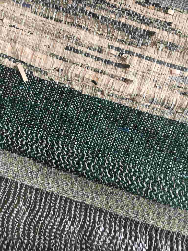 On the loom at the moment is a mixed warp including extremes of thickness and texture. Thick jute yarns sit next to extremely thin cotton/steel mixed yarns, and glimmering gold synthetic threads abut thicker matt linens. It’s a challenging warp to weave, as the tensioning is tricky to maintain, but the results are so satisfying. The first piece shown below uses an honeycomb weave over 24 shafts, and this piece will become a wall hanging. I’m also making some more work with cassette tape, and plan to try out some multiply layered pieces. Watch this space!