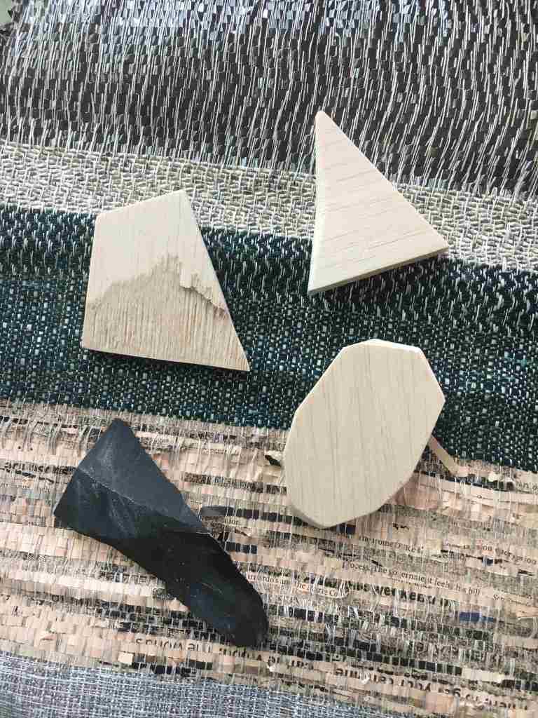 I love jewellery, and the more unusual materials, shapes and forms the better. For a long time now, I’ve been mulling over how to incorporate woven textiles into jewellery pieces in an unusual and contemporary manner, and recently the pieces of the puzzle fell into place for me. Having woven some small samples with unusual and fragile materials, such as paper, I have used these together with wood to produce a series of brooches, pendants and earrings inspired by the forms of the pebbles I’ve collected and sketched over time. Below you can see my design process, and over the next few weeks I will be finishing these new items and making them available to buy. I would love to hear your comments. So far, the response on social media has been very positive.