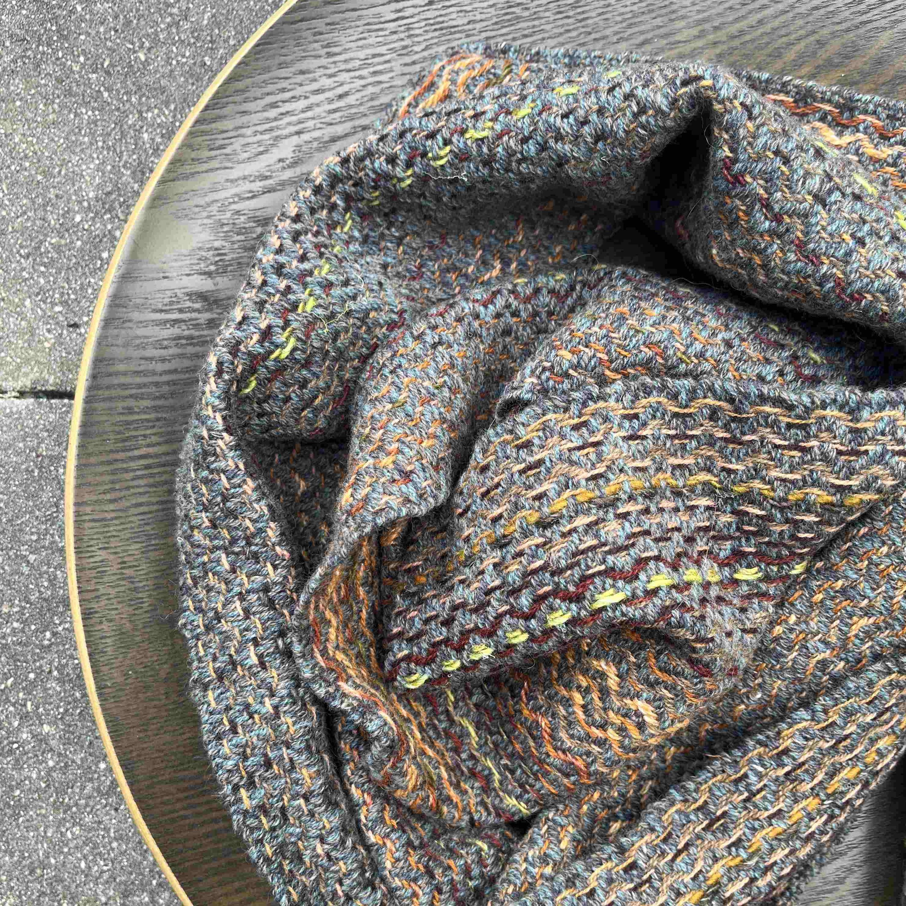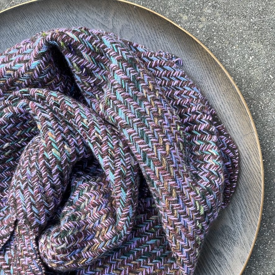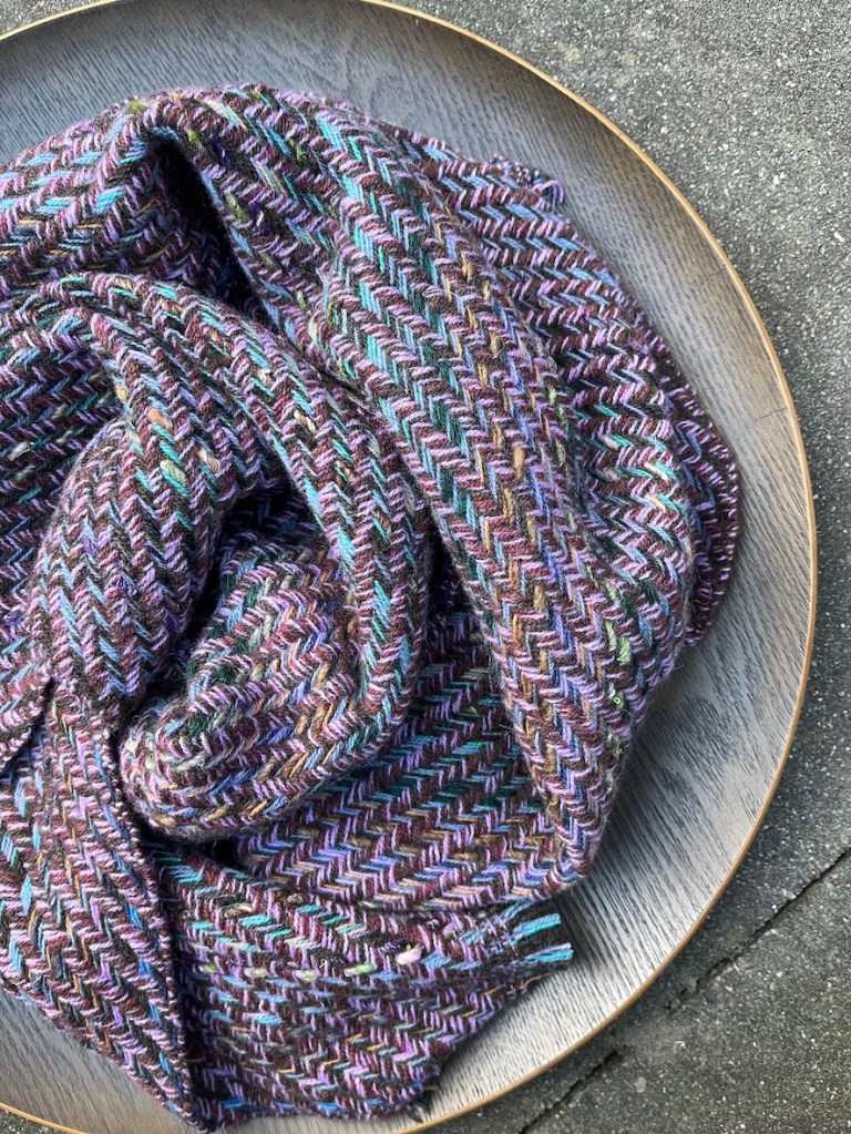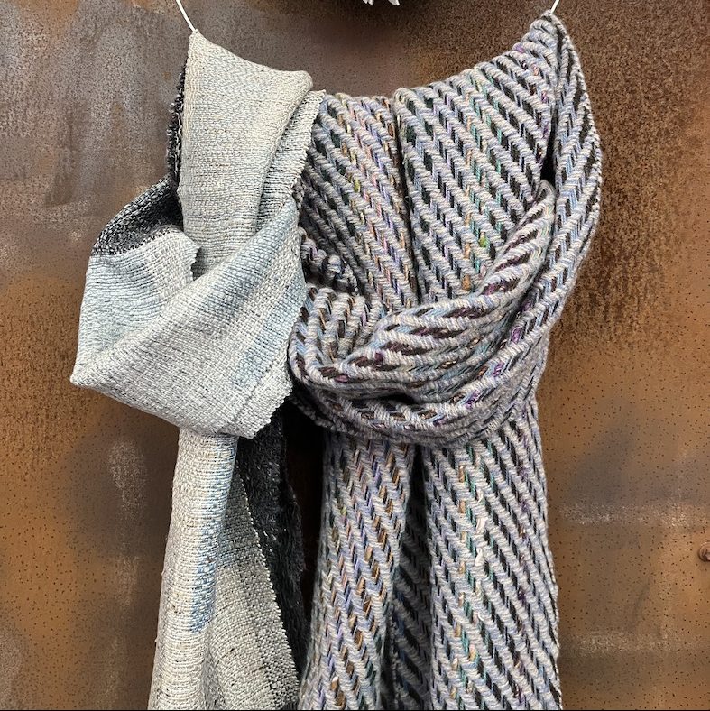My unique scarves are rich in colour and texture, woven by hand in a combination of responsibly sourced lambswool, cotton, linen and silk. Some scarves use small amounts of mill-end synthetic yarns. A selection of my scarves is available to buy at LiminalWEAVE.