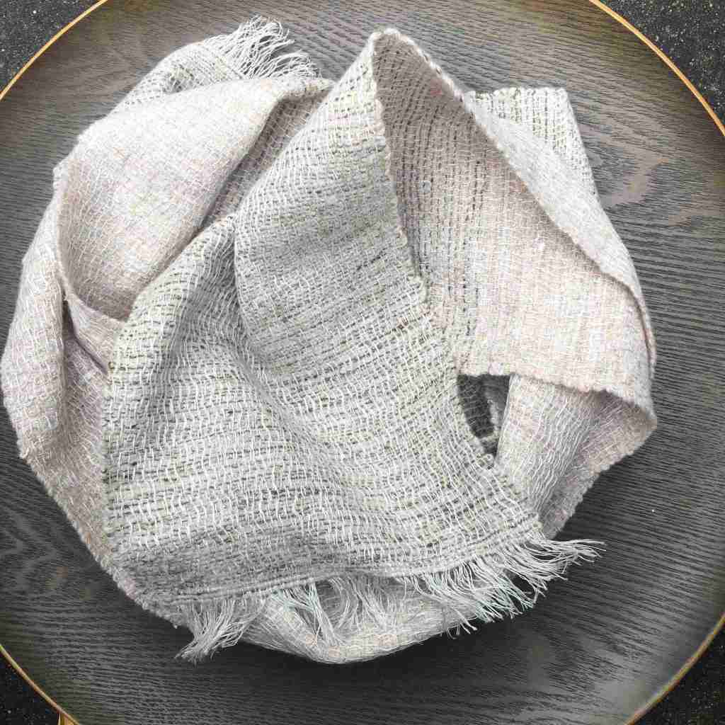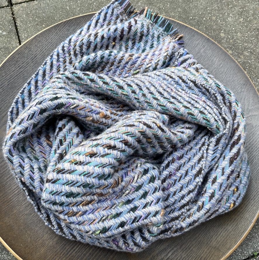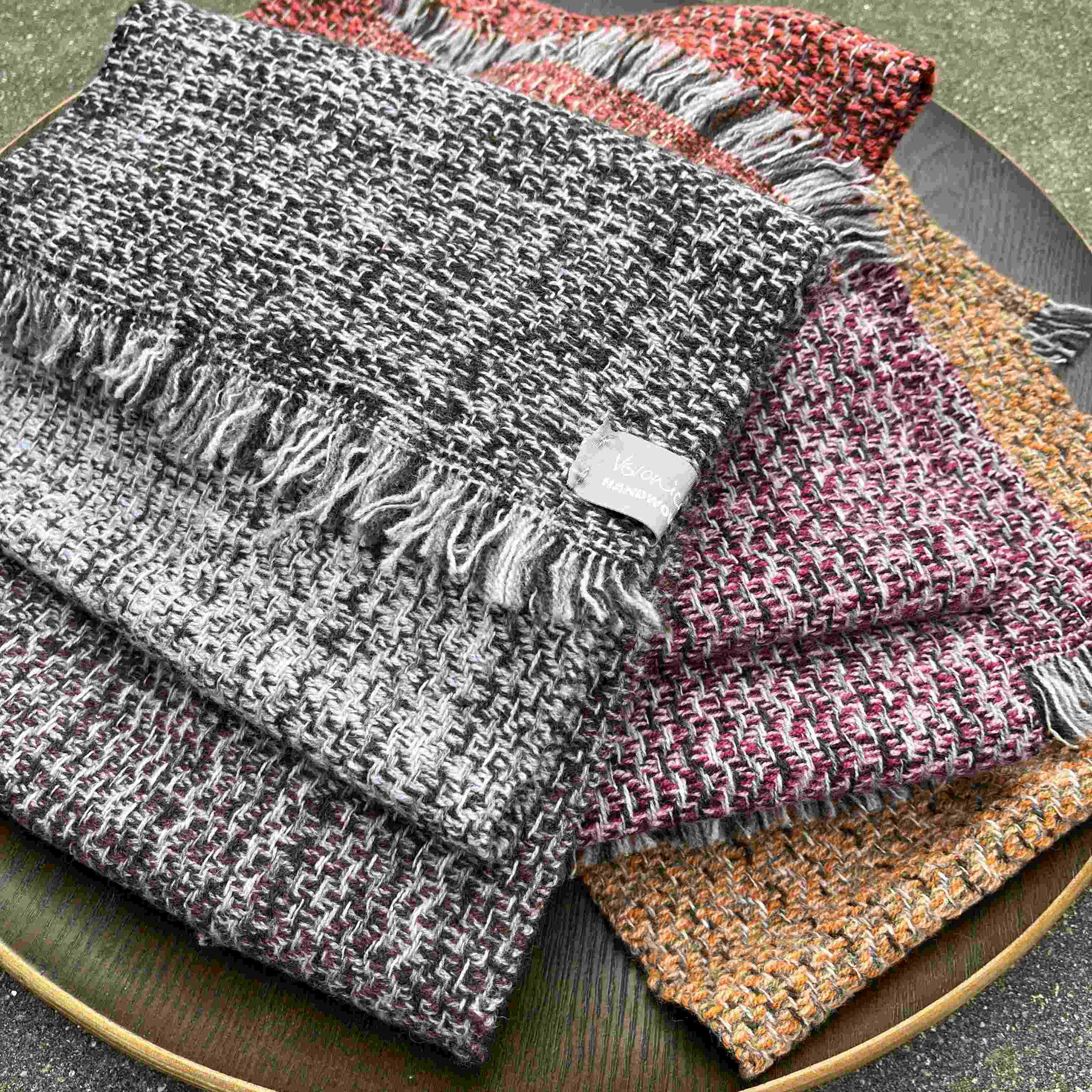 My unique scarves are rich in colour and texture, woven by hand in a combination of responsibly sourced lambswool, cotton, linen and silk. Some scarves use small amounts of mill-end synthetic yarns. A selection of my scarves is available to buy at LiminalWEAVE.
