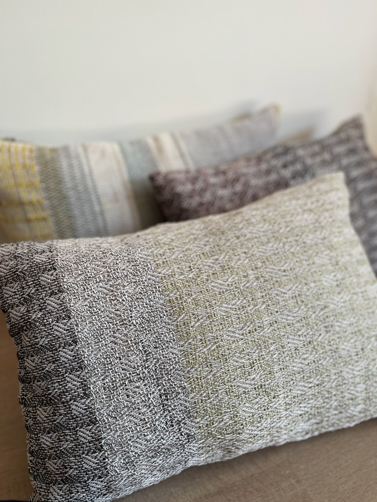 Each year I create one collection of unique cushion designs. The current collection is available to buy at LiminalWEAVE. It uses earth colours and a variety of wools, including ecological wool/alpaca mix, Scottish wool from the Ardalanish Mill on the Isle of Mull, and merino lambswool, grown in Australia and spun in Yorkshire, UK.